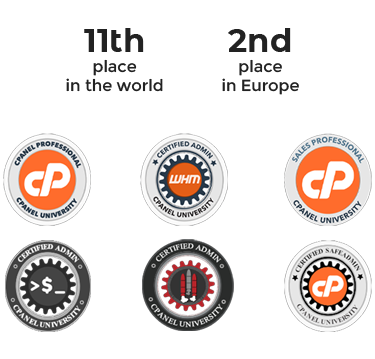 We are an official authorized cPanel partner in Europe, and our team has earned dozens of certificates and completed numerous training courses within the cPanel University. We are proud to say that we are ranked 11th in the world and 2nd in Europe in the ranking of the best cPanel specialist teams. This is proof of our commitment and the highest competence in hosting management.