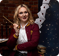 A student who should be writing a paper but is still staring out the window, waiting for the Hogwarts owl. In the meantime, she experiments with the magic of broomstick travel and cooking, and her spells in the kitchen sometimes come out better than those in real life.